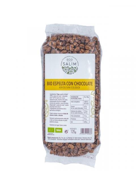 Ingredientes: Espelta hinchada, azucar de caña, chocolate amargo (pasta de cacao, azucar de caña, manteca de cacao, emulsionante: lecitina de soja, vainilla natural) cacao en polvo desgrasado, sirope de glucosa, estearina de palma.