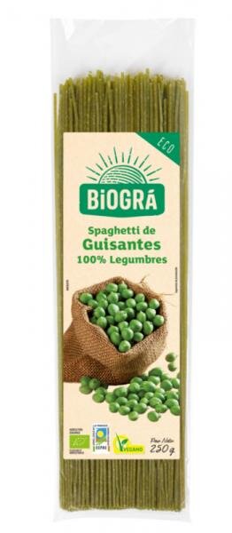 Pasta alimenticia ecológica elaborada con harina de guisantes 100%. Estos spaghetti de guisantes pueden ser de gran ayuda para integrar las legumbres en la alimentación familiar. Peso: 250G.