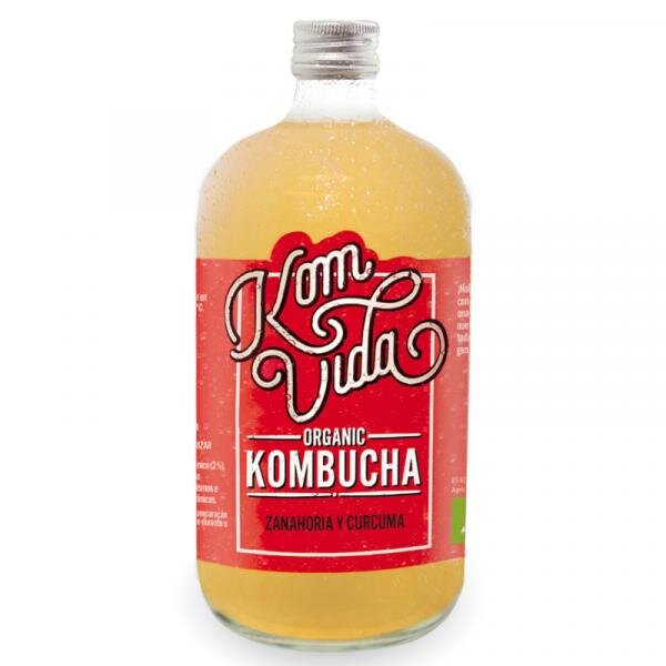 Ingredientes: Agua mineral, azúcar de caña ecológica*, té verde ecológico (2%), cultivo de kombucha (simbiosis de microorganismos y levaduras), zanahoria y cúrcuma.
