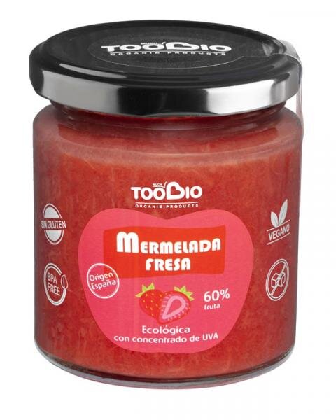 Mermelada de calidad extra de fresas. Producto tradicional a base principalmente de arándanos y concentrado de zumo de uva. Presenta una textura tipo puré bastante consistente, en el que aparecen trozos de fresas. Envase de vidrio transparente, cierre a rosca de tapa metálica con botón de seguridad y libre de Bisfenol A (BPA).