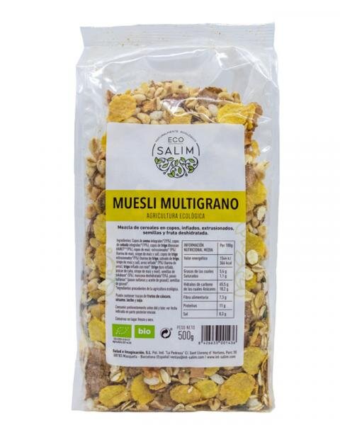Ingredientes: Copos de avena integrales*, copos de cebada integrales*, trigo hinchado con miel* (Trigo hinchado 66,4%, azúcar de caña, miel 14%, stearina de palma), copos de maíz extrusionados* (harina de maíz, extracto de malta de cebada, sal), copos de trigo integrales extrusionados* (trigo integral, salvado de trigo, azúcar, malta de cebada, sal), copos de trigokhorasan KAMUT* 10%, arroz crujiente* (harina de arroz, extracto de malta de cebada, sal), pipas de calabaza peladas*, manzana deshidratada*, pasas sultanas*(pasas sultanas, aceite de girasol), pipas de girasol*.