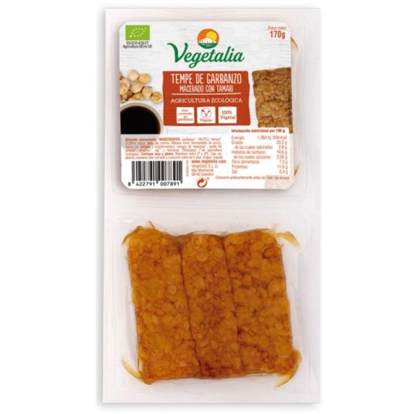 Ingredientes: Garbanzos*(66%), agua, vinagre de manzana*, tamari*(8%) (soja, sal marina, Ikawa mirin, harina de cebada, koji), fermento (Rhizopus), jengibre*, ajo*, aceite de girasol*. (*de agricultura ecológica). Puede contener trazas de gluten y de soja.